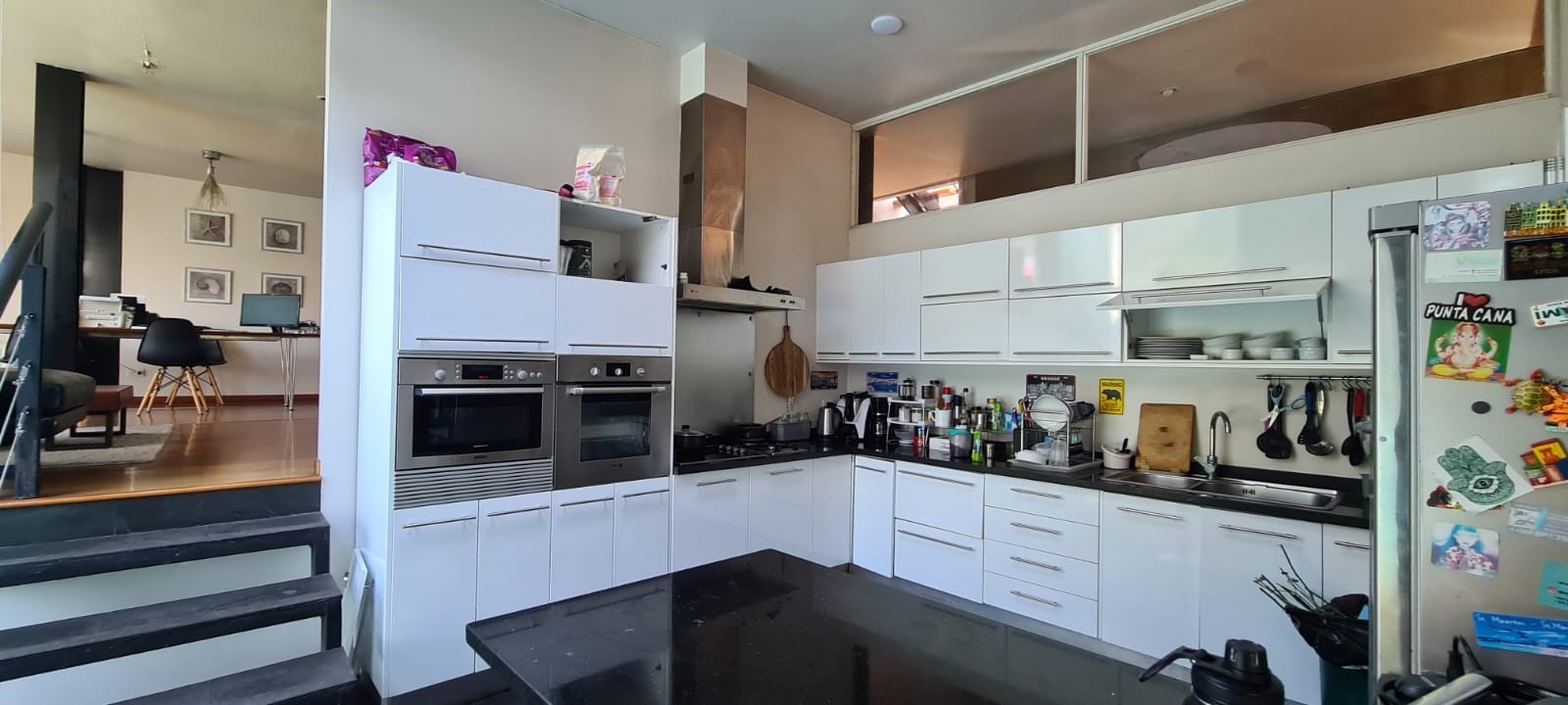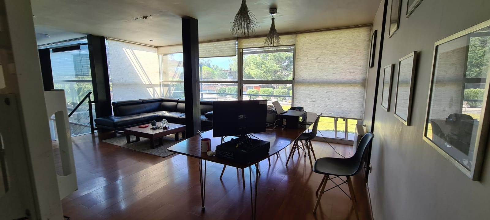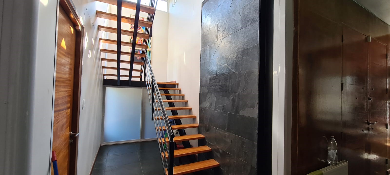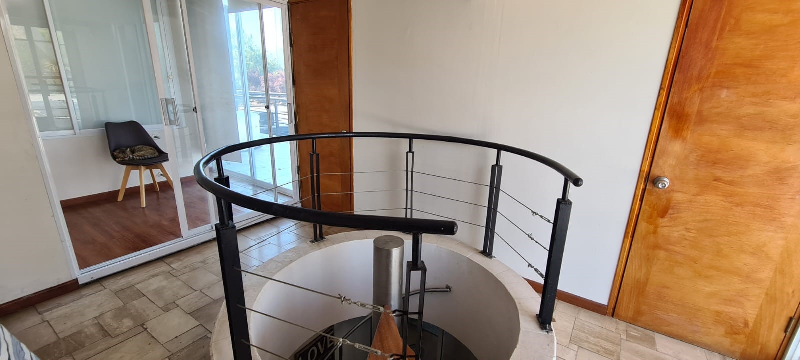 Hall de distribución, baño visita, living y comedor juntos, cocina amoblada, sala de estar o estudio con escalera caracol que conecta al segundo piso.