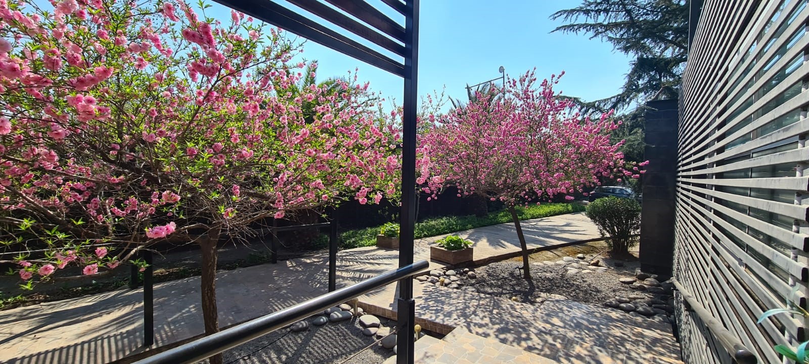 Precioso jardín formado por macizos arbustivos, arboles frutales, área de huerta, piscina temperada.